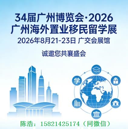 2026 年 8 月 21-23 日,第 34 届广州博览会海外置业移民留学展将在广交会展馆盛大举行。展会立足大湾区核心城市广州,汇聚全球跨境服务资源,为大众提供全球化置业、教育、移民、财富管理一站式服务,解锁高品质跨境生活新方式。